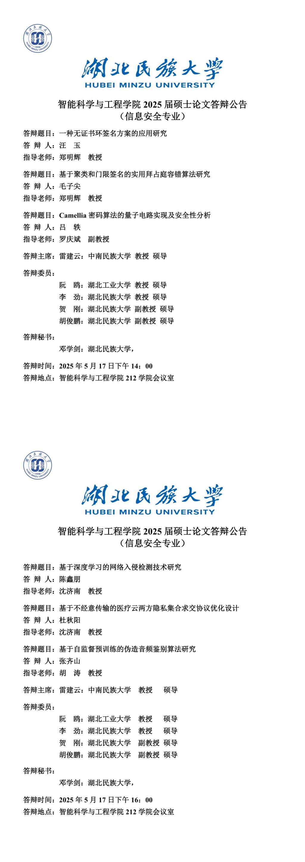 智能科学与工程学院2025届硕士学位论文答辩公告(六)