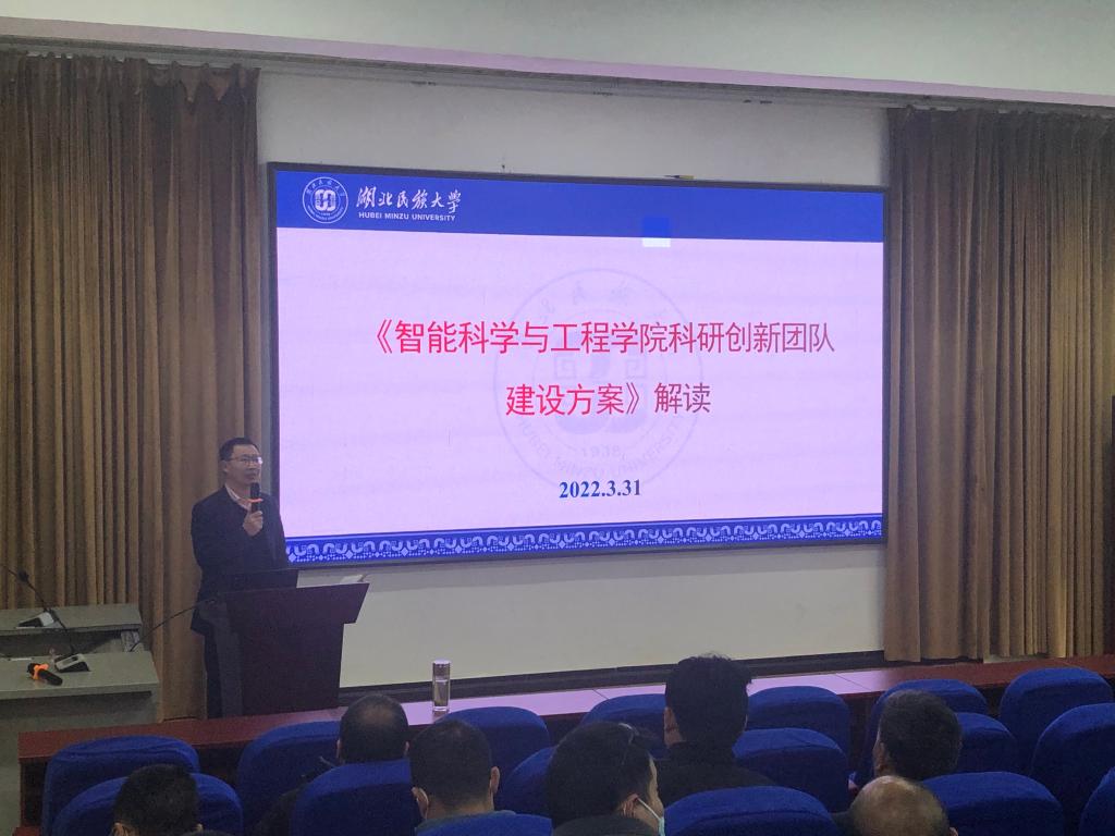 2022年3月31日,智能科学与工程学院在学院二楼学术报告厅召开科研创新团队建设推进会,党委副书记、执行院长陈世强主持会议,党委书记孙先波对《智能科学与工程学院科研创新团队建设方案》作解读,109名教职工参加会议。