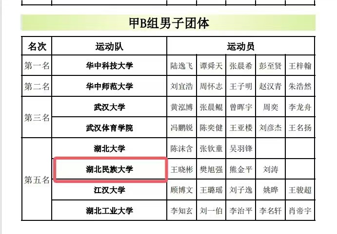 湖北省普通高等学校乒乓球比赛是省内乒乓球项目的传统赛事,同时也是全省大学生乒乓球项目的最高水平赛事。此次赛事斩获佳绩,离不开同学们平时的刻苦训练,更离不开指导老师的辛勤栽培。我校参赛运动员在省级赛事平台上以实际行动诠释了中华体育精神的内涵,展现出民大学子积极向上、勇于拼搏的青春风采,同时也较好地体现了我校体育学院良好的办学水平,为助力学校体育学科高质量发展贡献力量。