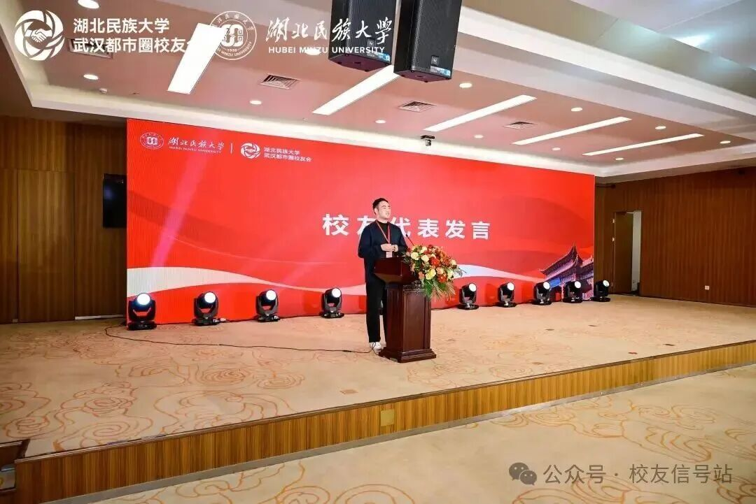 新当选的湖北民大武汉都市圈校友会会长、武汉毕上教育科技有限公司董事长夏晓华发表就职讲话。他首先对上一届校友会奠定的良好基础及各位校友的信任与支持致以衷心感谢,并围绕“打造‘出圈’校友会:融通学术圈、创业圈、就业圈”的主题,阐述了未来的发展规划。