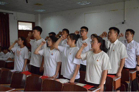 会议伊始,主持人讲述会议两个议程,议程第一项,预备党员起立,宣读入党誓词,宣誓完毕。