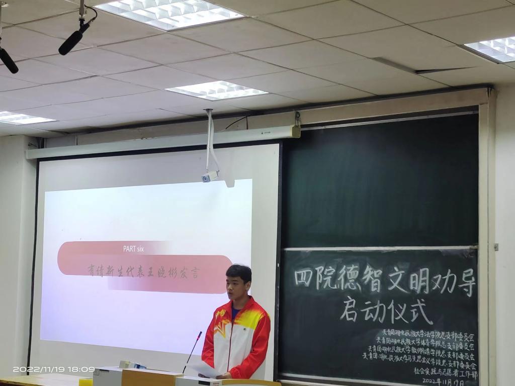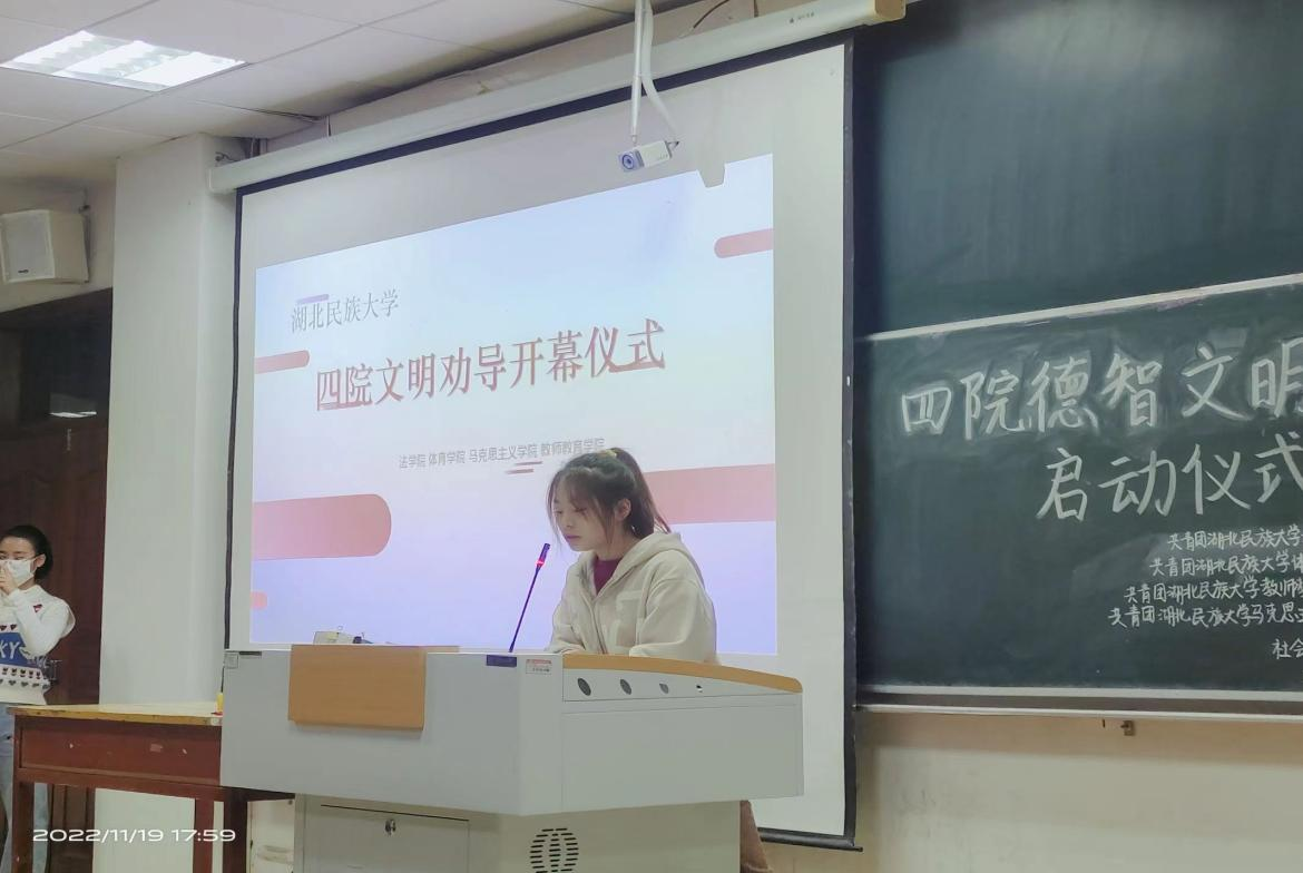 为弘扬“奉献、友爱、互助、进步”的志愿者精神,增强志愿者的服务意识、奉献意识,加强志愿者之间的工作交流,培养我校大学生卫生意识,构建良好的校容校貌和卫生环境。我院与法学院,马克思主义学院,教师教育学院于11月19日下午18:00在德智楼9B401教室联合开展德智文明劝导活动启动仪式。由四院全体青年志愿者参加本次活动。