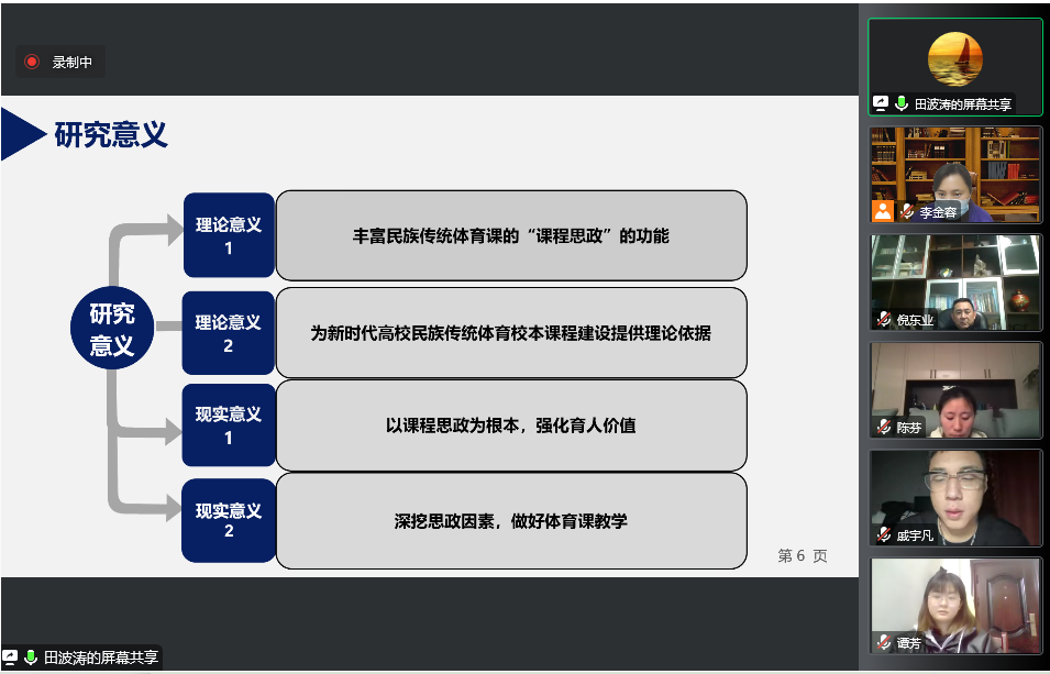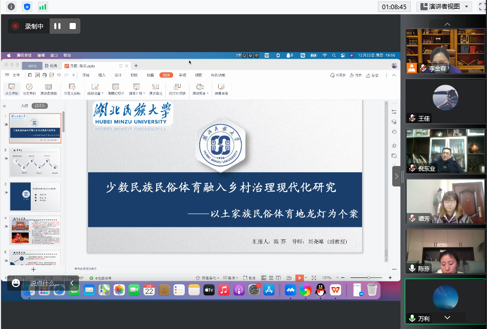 12月22日晚,体育学院举行了2021级硕士研究生预开题线上报告会。体育学院院长倪东业、书记何斌、副书记万利、学科建设科科长李金容、王佳博士、王先茂博士、张辉博士参会,会议由李金容老师主持。
