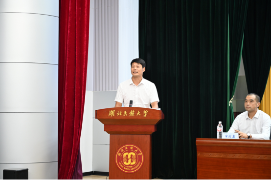 9月14日晚八点,我院2025级新生开学典礼在行政楼一号会议室隆重举行。学院领导班子成员、党支部书记、各科室负责人、系部(中心)主任、全体辅导员、新生班主任、教师代表,特邀嘉宾我院2008届校友、芭蕉侗族乡中心学校党支部书记吴海琼和09届校友、来凤维国道路建设工程有限责任公司董事长田维,以及老生代表和2025级全体新生共同出席典礼。典礼由体育学院党总支副书记万利主持。