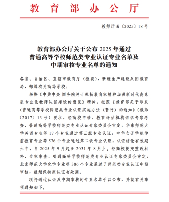 近日,教育部办公厅正式发布《关于公布2025年通过普通高等学校师范类专业认证专业名单及中期审核专业名单的通知》(教师厅函〔2025〕18号)。根据通知,我院体育教育专业通过普通高等学校师范类专业中学教育第二级认证,认证结论有效期六年,自2025年9月起至2031年8月止。