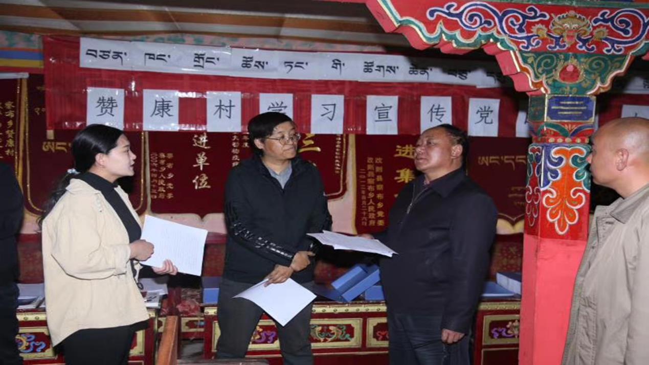 图为王美玲(左一)在海拔4700米以上的赞康村接受改则县委书记的亲切慰问