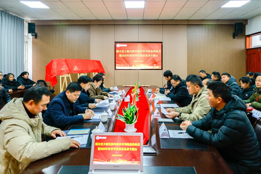 省民宗委民族二处处长江莉、四级调研员李超,省少数民族体育协会秘书长郭用德,总裁判长倪东业,恩施职业技术学院相关负责人,以及365电子娱乐官方网站体育学院领导班子成员、各科室负责人、三个基地教练组和全体运动员代表参加会议。会议由体育学院党总支副书记、院长何斌主持。