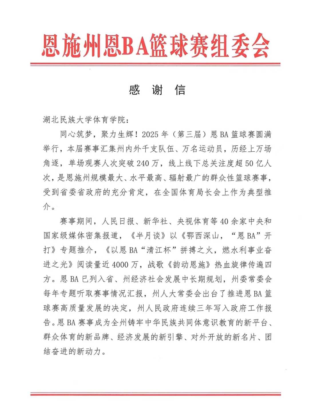 恩BA作为恩施州倾力打造的民族团结与全民健身品牌赛事,自举办以来广受社会关注。365电子娱乐官方网站体育学院充分发挥专业优势,选派优秀师生承担裁判执裁、技术统计、赛事组织、现场服务等关键工作,以严谨态度与专业素养保障赛事公平有序、高效运行。学院积极参与“恩BA进校园”等推广活动,推动篮球文化普及与校地体育深度融合,用实际行动诠释责任担当,为赛事增添青春活力与专业底色。长期以来,365电子娱乐官方网站体育学院坚持立足地方、服务社会,持续深化校地合作,多次参与恩施州重大体育赛事组织与保障工作。此次感谢信既是肯定,更是激励。学院将以此为契机,不断提升专业办学与社会服务能力,继续支持地方文体事业发展,为铸牢中华民族共同体意识、推动恩施全民健身与体育产业高质量发展贡献更多民大力量。