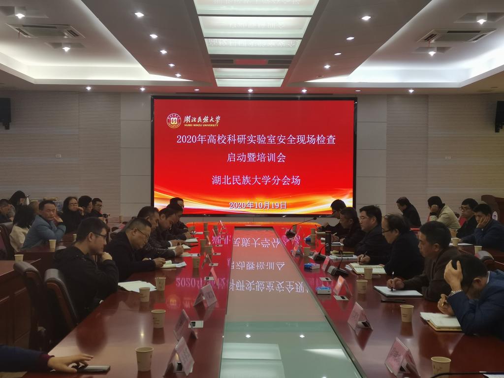 本网讯(通讯员 李永亮)2020年高等学校科研实验室安全现场检查启动暨培训会于2020年10月19日在北京召开 ,根据教育部、湖北省教育厅统一部署,各高校设分会场,我校分会场设在行政楼3号会议室。副校长邓磊,科技处、保卫处负责人,实验室建设与管理处、武陵山中药材检验中心及省级重点实验室全体管理人员,各二级学院分管实验室副院长、实验室(中心)主任、部分科研教师共计80余人参加培训学习。
