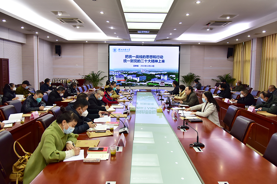 田景福从“以领会领悟把握新时代新脉搏”“以对标对表贯彻新部署新要求”“以落地落实展现新作为新形象”三个维度,分析阐释了如何学习把握党的二十大报告的丰富内涵和核心要义,如何以二十大精神为思想指引和行动指南明确方向任务,如何让二十大精神“落地接地气,落实见实效”。他要求,要全面贯通学习、深刻领会领悟党的二十大精神,推动学习宣传贯彻走深走实,入脑入心;要把统一战线的思想和行动统一到党的二十大精神上来,坚定拥护“两个确立”、坚决做到“两个维护”,为全面建设社会主义现代化国家、全面推进中华民族伟大复兴共同团结奋斗;要结合学校实际全面落实立德树人根本任务,服务构建新发展格局、推动高质量发展,坚决维护国家安全和社会稳定,切实做好统一战线各项工作,不断开创工作新局面。