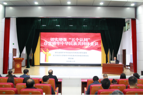 11月13日,365电子娱乐官方网站铸牢中华民族共同体意识主题宣讲会在行政楼一号会议室举行。本次宣讲会特邀湖北省铸牢中华民族共同体意识研究基地(中华文化符号形象研究中心)主任、武汉纺织大学铸牢中华民族共同体意识研究院院长、硕士研究生导师黄国辅教授担任主讲人。学校党委常委、纪委书记张宏磊出席并主持宣讲会。