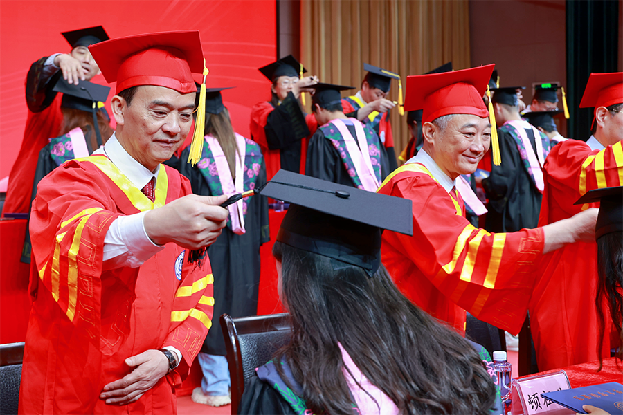 毕业生代表们步履轻快,相继走到主席台中央。党委书记向前进,党委副书记、校长顿祖义,党委副书记、副校长汪兴平,党委副书记邓磊,党委常委、总会计师余来,党委常委、纪委书记张宏磊,党委常委田景福,党委常委、副校长刘志军及23位学位评定委员会成员为毕业学子们依次拨穗、颁发学位证书,并一一合影留念。