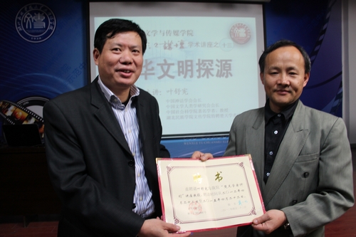 本网讯(记者 刘婉 杨玲玲)“要走出文字牢房,探寻文化大传统。”4月23日,中国社会科学院教授、文学人类学研究会会长叶舒宪教授在文学与传媒学院附楼演播厅举办的“中华文明探源”学术讲座中如是说。据了解,叶舒宪接受文学与传媒学院聘书,将在该院授课五年。