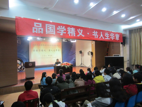 徐定辉副院长联系自身经历和具体事例,以“继承国学经典”和“完善国学不足”为切入点,围绕“国家民族精神”、“文化立身哲学”、“君子忧患意识”、“古人敬畏思想”、“国学局限境地”五个方面展开讲座。他引用《论语》、《国语》、《诗经》、《离骚》等国学名著中的经典语录,深刻解析了屈原辛酸的爱国情怀、苏轼洒脱的自强精神、孔子厚德的教子方式及韩愈克己修身的敬畏之道等,引导同学们树立“救世安民”、“自强厚德”的观念。他指出,同学们在和平时代也应具有忧患意识和敬畏思想,应在加强自身道德建设的同时,勿忘国学,认真学习中国传统文化。在总结中,徐老师对中西方文化的异同做了简要论述,并要求同学们在弘扬国学的同时,中西方结合,吸收西方文化的精华部分,将国学精神作为成人成才、修身立业的精神滋养,为大学生活、今后事业发展护航。