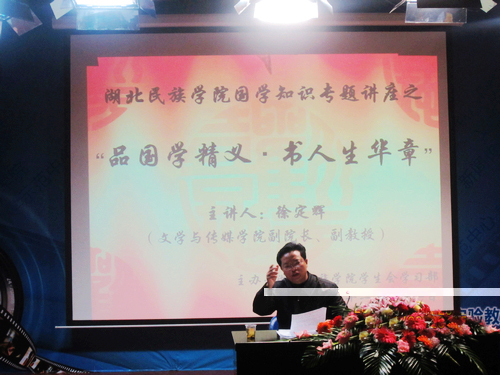 本网讯(记者 刘婉 杨玲玲 邓杰/文 周璐/图)“品国学精义,书人生华章”。11月21日晚,我校国学知识专题讲座在我院附楼演播厅举行,我院副院长徐定辉担任主讲,来自各二级学院的学生干部及百名余学生聆听了本次讲座。
