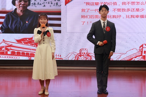 “双人搭档主持”环节,选手两两分组进行展示。一号选手黄亮和二号选手李思杨为观众讲述《民大月刊》,举止大方得体,声调字正腔圆,通过讲述校园里的人和事,引发观众共鸣;九号选手刘昊星和十号选手夏露带来的《浮世微光》,通过讲述张桂梅老师的先进事迹表达出对其的诚挚敬爱。