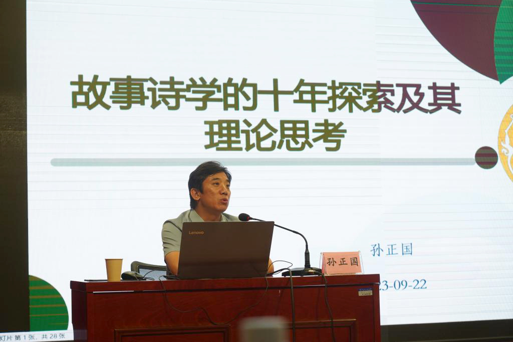 随后,孙正国教授“故事诗学的十年探索及其理论思考为题展开讲座。他从一个关于“乞丐”的故事引出话题重点从故事诗学的研究缘起与十年探索、学科语境的追问与发现、大故事的诗学体裁及其伦理品格、民间审美的诗学立场、故事诗学的可能性与方法论思考等五个方面进行讲述。