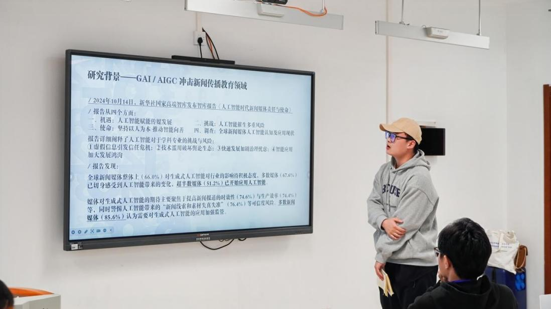 石长顺教授以《教师AI素养:思维、能力与教学》为题,围绕教师AI的素养内涵、素养框架、素养要素三方面展开了论述,指出人类未来必须学会与人工智能共生。同时,他还与座师生共同探讨了未来的新闻传播人才应具备的AIGC能力。