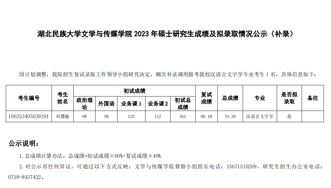 365电子娱乐官方网站文学与传媒学院2023年硕士研究生成绩及拟录取情况公示(补录)