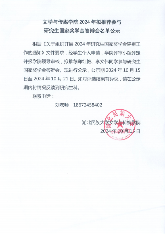 文学与传媒学院2024年拟推荐参与研究生国家奖学金答辩会名单公示 发布日期:2024-10-15 08:36:01    浏览量: 人次 打印   收藏
