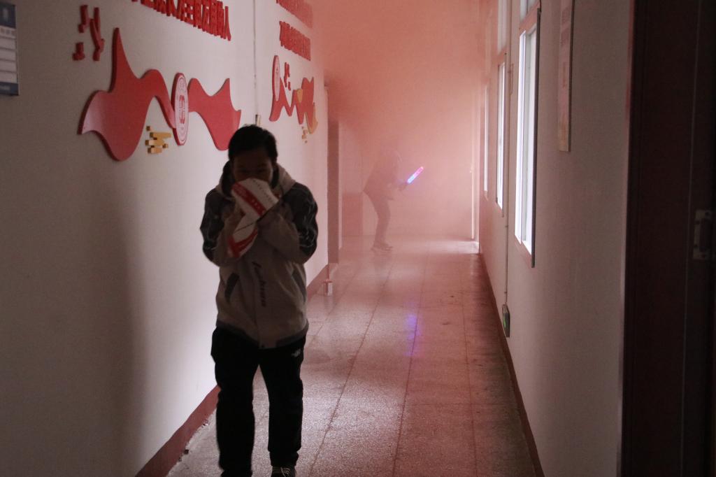 16点00分,随着警报的响起,演练拉开了序幕。烟雾扩散后,报警组郑泽红老师立马拨打了报警电话,随后快速向学院领导报告了失火情况;广播组通过广播的形式指挥大家有序撤离;疏散组和楼层定点引导疏散组迅速行动,在楼道内疏散师生;老师和同学们在疏散组引导下,用毛巾捂住口鼻,低头躬腰,从相应出口有秩序、有组织地快速下楼