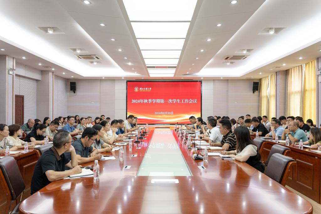 8月30日,学校2024年秋季学期第一次学生工作大会在行政楼3号会议室召开,学校党委副书记邓磊出席会议并讲话。学校相关部门负责人,各学院(部)党委(总支)书记、分管学生工作领导、全体辅导员、学生工作部(处)、校团委全体职工参加此次会议。