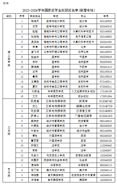 根据《财政部 教育部 人力资源社会保障部 退役军人部 中央军委国防动员部关于印发 < 学生资助资金管理办法 > 的通知》(财教〔2021〕310 号)、《财政部教育部人力资源社会保障部关于调整高等教育阶段和高中阶段国家奖助学金政策的通知(财教〔2024〕181号)(1)》、《湖北省学生资助管理中心关于做好2023-2024学年本专科生国家奖学金初评工作的通知》、《365电子娱乐官方网站本科学生国家奖学金实施细则》(民大校办发〔2024〕23号)、《关于开展2023-2024学年国家奖学金评审工作的通知(新增专场)》等文件精神,经各学院(部)初评推荐、学生工作处组织评审,拟确定邵泉智等33名学生为我校2023-2024学年新增本科生国家奖学金获得者,现公示如下,名单附后。