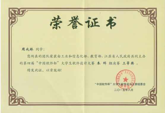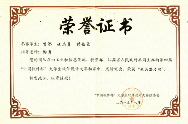 在2012年信息工程学院计算机科学与技术专业部分学生参加第一届中国“软件杯”大赛,2013年组织参加了第二届中国软件杯,并获得了全国二等奖的成绩。在总结前两届比赛结果的基础上,通过总结上次比赛经验的不足,认真做好各项赛前工作,并于2015年4月份组织部分指导教师及学生参加了第四届中国“软件杯”大学生软件设计大赛。本次比赛信息技术创新中心经过两个多月的认真准备、选拔、培训及指导,最终在6月30日前成功提交5件作品。经过参赛师生的共同努力,在总结上次比赛失败教训的基础上,在全国500多所高等院校2000多件件参赛作品当中,我校最终有1件作品成功入围现场决赛。8月17-20日在南京航空航天大学举行的第四届中国“软件杯”大赛现场决赛中,经过现场展示、综合评审与答辩评审三个环节,我校参赛选手杜周成林、田景凡、黄长江等3名同学的作品“比特能机器人”得到了全场评委专家的一致好评,最终荣获了全国三等奖。其他三支参赛队的作品在现场表现也不错,获得了“优胜奖”等奖项。