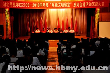 大会在庄严的国歌声中拉开帷幕。学工处处长洪雁宣读了《关于表彰湖北民族学院2009-2010学年度“星级文明寝室”、“星级文明楼层”、“星级文明楼栋”及优秀组织单位的决定》,对科1205等8个红旗寝室、科9408等30个五星级文明寝室、7212等102个四星级文明寝室、4705等195个三星级寝室;李娜等30名标兵寝室长、边向堃等102名模范寝室长、邓明等192名优秀寝室长;十一栋六层等3个三星级文明寝室楼层;科8栋一个三星级文明寝室楼栋及信息工程学院学生会公寓部等6个优秀组织单位予以表彰。随后,与会领导为获奖寝室、楼层、楼栋及优秀组织单位和个人颁发了奖状。