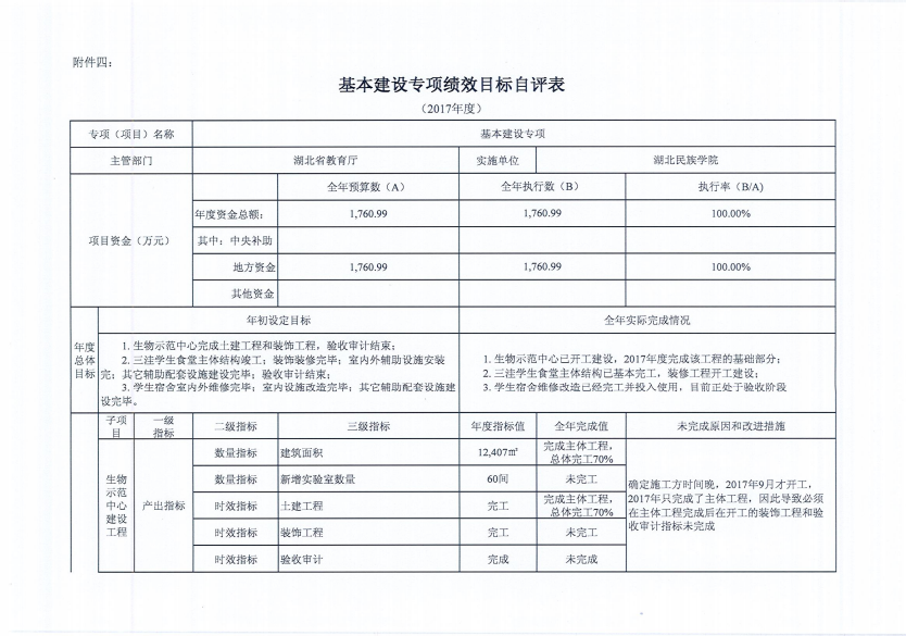 基本建设专项绩效自评综述:项目全年预算数1,760.99万元,执行数1,760.99万元,完成预算的100%。主要产出和效果:本次自评工作共完成17项具体绩效指标评价,其中产出指标16项、效益指标1项。经评价,绩效指标总体完成9项,完成率53.94%,其中完成产出指标9项,完成率56.25%;效益指标目前未完成。发现的问题及原因:一是年初设定目标时未充分考虑工程招标周期、招标流标、天气等不可抗力因素对绩效目标完成情况的影响,导致年初设定目标偏高;二是对依赖土建等主体工程完工后才能继续开展的装饰工程、验收审计等进度预计不够,由于主体工程完工时间较晚导致后续装饰工程、验收审计等绩效指标未完成绩效目标。下一步改进措施:以后在设定该类指标年初绩效目标时,学校将更加实事求是、科学规划,充分考虑各种因素对工程进度的影响,按项目实施的实际情况制订绩效目标。同时,学校也将进一步加强基本建设工程管理,理顺内部工作机制,切实保障项目实施进度。