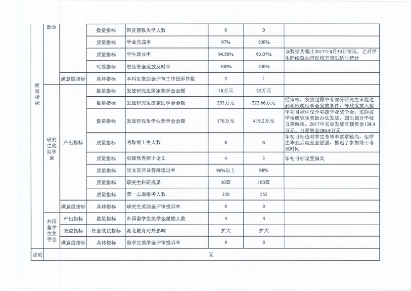 学生资助专项绩效自评综述:项目全年预算数3,021.33万元,执行预算2,908.93万元,完成预算的96.28%。主要产出和效果:项目年初绩效产出指标共计19项,完成产出指标14项,完成率73.68%,年初设定的产出目标基本完成。发现的问题及原因:特等奖学金发放人数和研究生助学金发放金额未全部实现,主要是在评审过程中部分评审对象不符合政策规定,最终未实际发放奖助金。研究生考取博士生人数、省级优秀硕士论文未实现的主要原因是学校在设定年初目标值时对学生考博率设置较高,但学生毕业后就业意愿强,推迟了参加博士考试时间。下一步改进措施:学校在编制年初目标时要更加适当、可行,在日常管理中,提高学生培养质量。