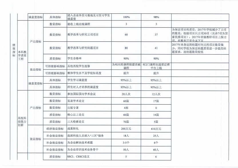 高等教育事业发展项目绩效自评综述:项目全年预算数为2,067.46万元,执行数为1,897.98万元,完成预算的91.80%。主要产出和效果:一是项目绩效产出指标共计147项,实际完成产出指标123项,完成率83.67%;二是项目绩效效益指标共计21项,实际完成产出指标17项,完成率80.95%。发现的问题及原因:科研项目研究周期较长,一般在2-3年,后续研究的产出目前尚无法统计,导致科研项目绩效目标未全部完成。下一步改进措施:一是加强科研项目后期跟踪管理,强化督导考核,对绩效目标未实现的科研项目不予结题,并将绩效目标完成情况与项目负责人后期课题申请、科研资金分配等挂钩考核;二是在下年度设定科学研究类绩效目标时充分考虑项目特性和实施具体情况,更加科学合理的设定年初绩效目标。