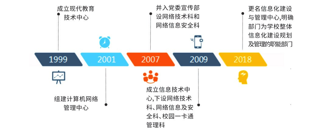 随着信息技术的发展,业务的不断扩展,2009年学校成立信息技术中心,下设网络技术科、网络信息及安全科、校园一卡通管理科,形成了较为完备的信息化建设机构及队伍。2018年,更名为信息化建设与管理中心,负责统筹学校信息化建设与管理工作,部门在编工作人员11人,聘用职工2人,其中高级工程师3人,网络规划设计师1人,信息系统项目管理师2人,另有信息系统管理工程师2人,网络工程师2人,信息系统监理师3人,为学校信息化建设与发展提供技术支撑。