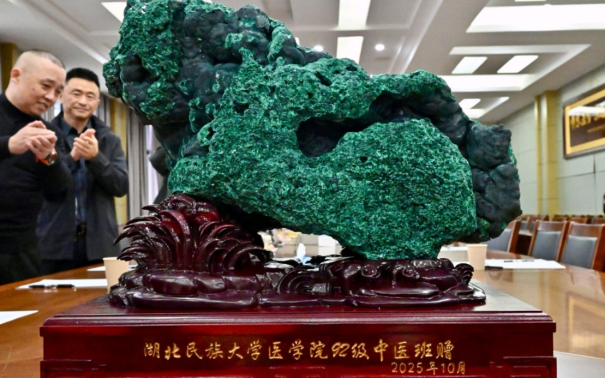 座谈会现场,1992级中医班校友代表全体同学,向母校赠送了书法匾额及一块具有3000年历史的孔雀石。