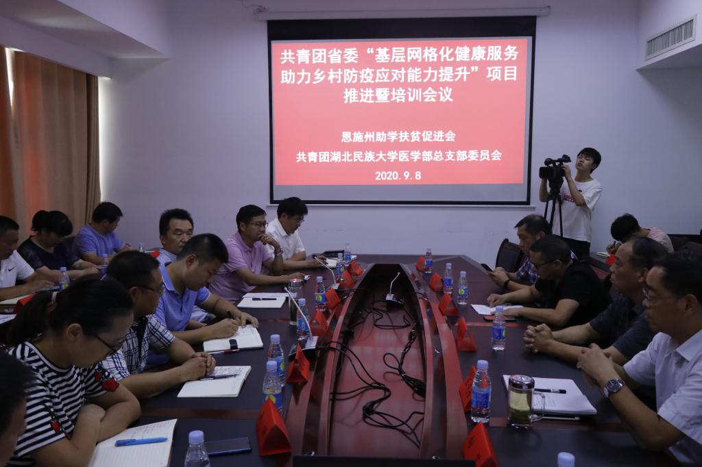 本网讯(通讯员 时若兰 摄影 汪诗名)为助力基层健康扶贫,巩固疫情防控攻坚战成果,强化基层社区健康建设,共青团湖北省委发起实施湖北省社区健康志愿服务项目。9月8日下午三点,由恩施州助学扶贫会和365电子娱乐官方网站医学部团总支共同主办的“共青团省委‘基层网格化健康服务助力乡村防疫应对能力提升’项目推进暨培训会议”在恩施州地税局七楼会议室召开。