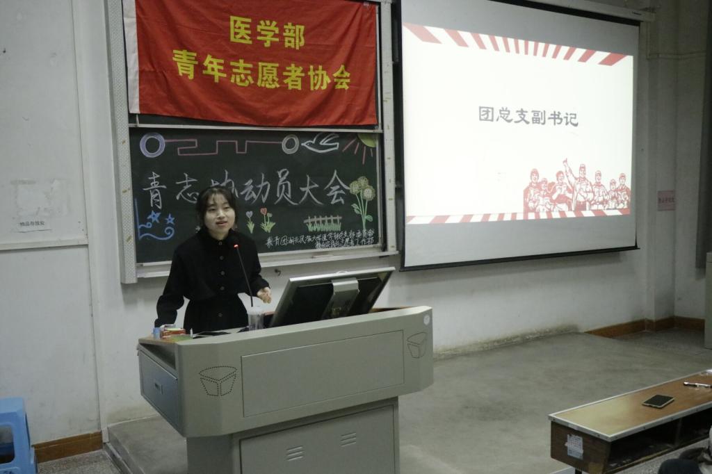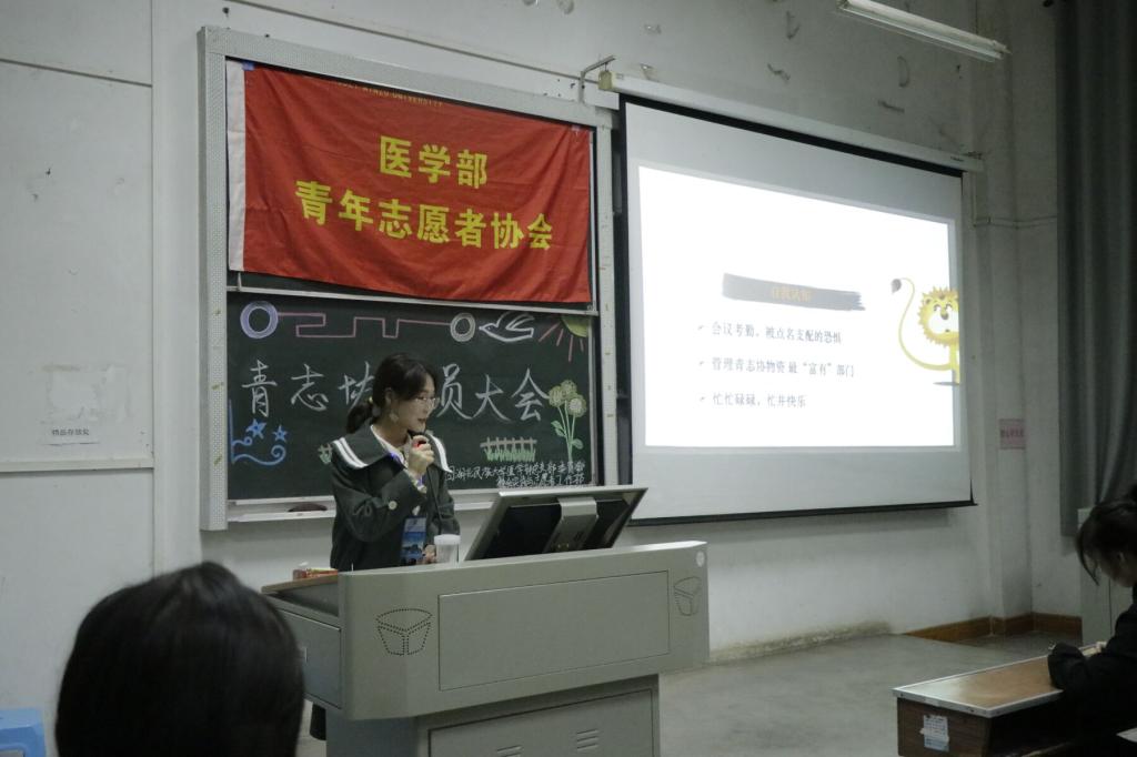 会议开始,全体志愿者宣誓,各部门负责人介绍本部门基本概况。医学部团总支副书记谢能能在会上发表讲话,号召新同学积极加入,努力提高自身的专业素养和能力素质;19届青年志愿者协会会长岳媛媛以其亲身经历对“奉献、友爱、互助、进步”的志愿者精神做出进一步阐释;