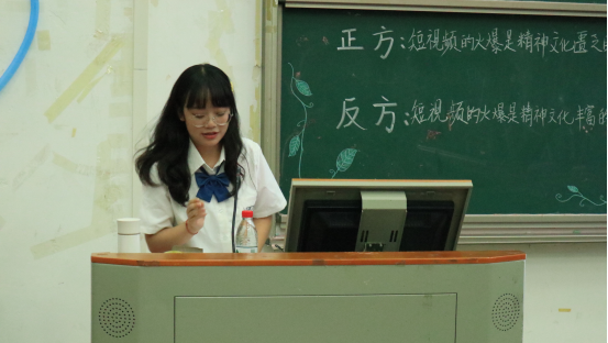 本场比赛分为开篇立论、攻辩环节、攻辩小结、自由辩论、观众提问、总结陈词六个环节。双方辩手以“短视频文化爆火是精神文化丰富的表现还是精神文化匮乏的表现?”为辩题展开了激烈的辩论。在攻辩和自由辩论环节中,双方唇枪舌战、据理力争,正方以“观看短视频思维深度并没有提高”“大数据显示人们精神文化更加匮乏”等论点展开攻辩,并通过科学研究的数据及短视频中的资本投资来与反方辩论。而反方则以“短视频文化是精神文化丰富的表现”“短视频激发了群众的文化需求”来驳回正方的论点,并列举李子柒走出国门等事件来反驳正方辩手陈词存在的问题。最终,正方二辩沈鑫杰与反方二辩江茜荣获“最佳辩手”称号。
