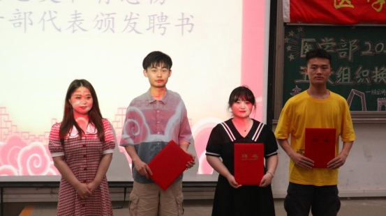 紧接着,由各位指导老师分别为学生组织主要负责人颁发聘书并合影留念,表达对他们工作的认可。大会进行第三项,周家頔老师宣读各学生组织新任学生干部名单。随后,由新任学生干部代表张恬发言,她认为学生干部要以身作则,不断要求自己,提高自身能力,有热情,有想法,干部之间要多交流。她表示今后的工作中会起到模范带头作用,初心不改,昂首展望未来,承担责任,恪尽职守。