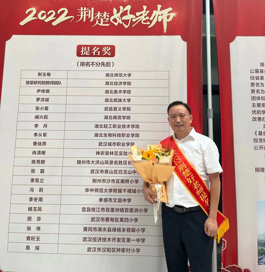 在第38个教师节来临前夕,2022“寻访荆楚好老师”宣传活动在武汉楚天传媒大厦揭晓评选结果。我校医学部罗洪斌教授获“荆楚好老师”提名奖。据悉,此次评选先后经过基层推荐,网络推选,教育专家、教师代表及媒体代表的联合评审,2名教师荣获特别奖,30名(组)教师荣获“荆楚好老师”荣誉称号,20名(组)教师荣获“荆楚好老师”提名奖。