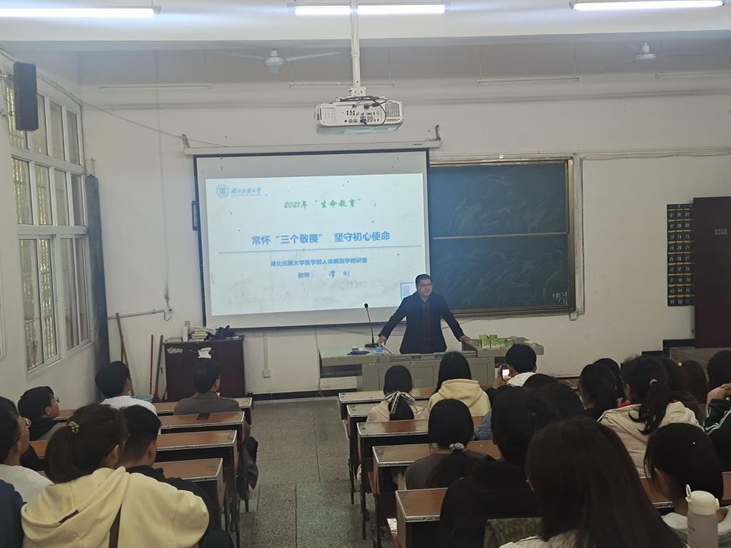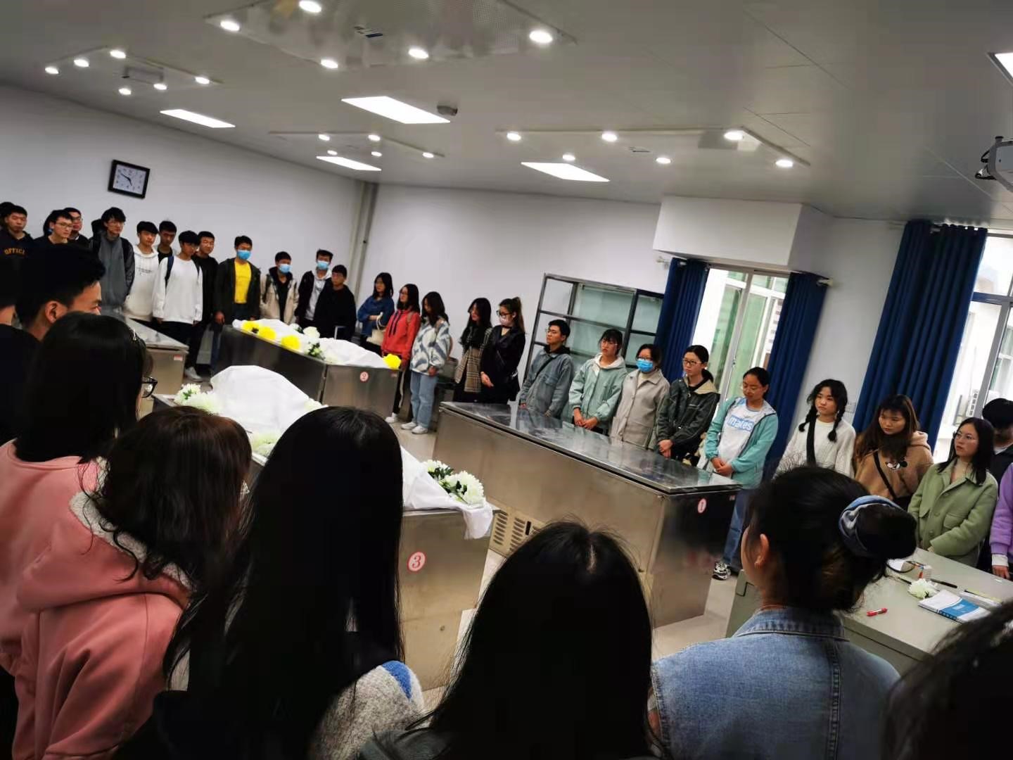 最后,谭刚老师和数学与统计学院团总支书记刘聪老师带领学生有序进入人体解剖学实验室开展了体验式生命教育,实现了生命教育与人文教育的整合,加深对生命的尊重、敬畏和对生命意义的理解,促进生命教育落地生根。