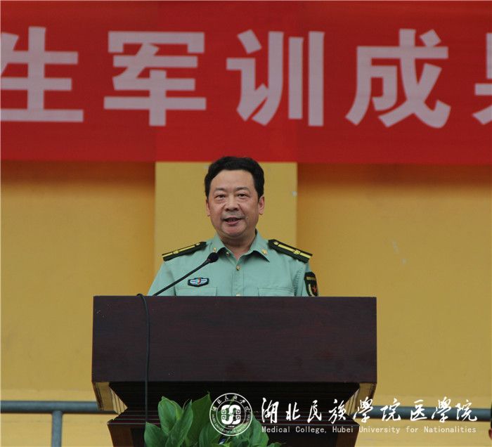 总结大会上,副校长汪兴平首先宣读了军训团表彰文件。授予2017级61名在军训中表现突出的学生以“优秀学员”称号,授予20名教官“优秀教官”称号。医学院、音乐舞蹈学院以及马克思主义学院获得“标兵连”。接着,学校党委书记吴建清代表学校党委向全体教官表示衷心的感谢,并向取得优异成绩的个人和集体表示祝贺。吴书记在讲话中充分肯定了此次军训的成果。他指出,在短短的12天里,我校先后进行了多项军事技能训练,开展了野外拉练、国防知识讲座、入学教育以及军歌大赛等活动,激发了同学们的斗志,磨练了意志,增强了合作意识和班级凝聚力,这为他们进入精彩而忙碌的大学生活奠定了坚实的基础。同时,吴书记也从“心怀爱国之情,践行报国之志”、“培养优良作风,做到知行合一”、“宏扬阶级精神,实现青春梦想”三个方面表明了自己对新生的期望,他希望同学们进一步巩固军训成果,将在军训中练就的优良作风和铁的纪律永远保持下去,把军人顽强的品格与求学严谨、认真的态度结合起来,做永伴时代发展的领头军。