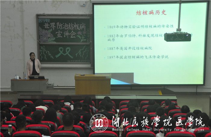 宣讲会伊始,别老师以鲁迅、林黛玉因结核病逝世事件为引使同学们初步了解结核病。接着,她列出数据说明近十年来我州在结核病甲乙类传染病发病人数中位居湖北省首位,形势非常严峻。而后,她围绕结核病的传播途径、常见病症和防治措施进行具体讲解。她提醒大家结核病可通过飞沫传播,在人流量大的地方要记得戴口罩保护自己,不给结核病菌可乘之机。结核病常见于咳嗽、咳痰、体温低热等症状,若患上结核病要立即就医,并且要彻底治疗以防复发。由于学校是人群高度集中场所,故对于学校如何做好结核防治工作,别老师提出应开展多形式的结核防治工作,及时发现、报告、管理肺结核疫情,积极做好预防工作。同时她告诫青年学生要少熬夜,注意作息规律,多锻炼身体。