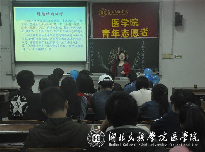 培训会伊始,别老师通过讲述结核病的种类以及发病症状入题,使同学们进一步了解结核病,以真实案例向同学们指出结核病的危害性,同时指出要大力宣传防治结核病的原因,并以具体的数据指出恩施州结核病情况的严峻性。随后,别老师从多方面提出有关学校做好肺结核病防治工作的要求,还从肺结核的预防、治疗及相关注意事项中作出“治疗不彻底,后果很严重”的总结。最后,别老师以提问的方式来检测同学们对相关知识是否掌握到位,并放出历年的结核病宣传资料作为本次培训会的收尾。