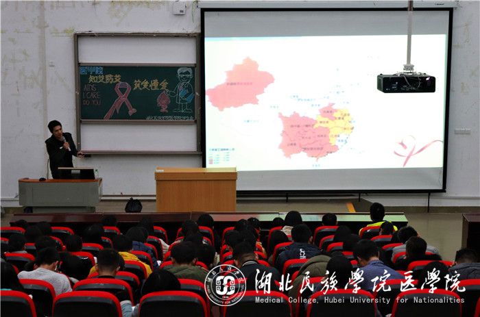 黄小林从“什么是艾滋病”、“艾滋病的历史”、“现阶段疫情特点”、“湖北省青少年学生疫情”等方面进行讲解介绍。他以2016年艾滋病全球流行状况的调查结果为例,告诉同学们艾滋病患者在不断增多并有逐年上升的趋势。他谈及,现阶段艾滋病主要以性传播为主,尤其是青年人群的艾滋病患者在持续增长。他表明,如今艾滋病频发的主要的原因是现在的人们缺乏对性的理解,并告诫同学们一定要有健康的性心理。随后,黄小林播放了关于预防艾滋病的小视频并提醒同学们,在遇到艾滋病时,一定不要慌张,要学会运用自己的医学知识,做到早检测、早发现、早治疗。
