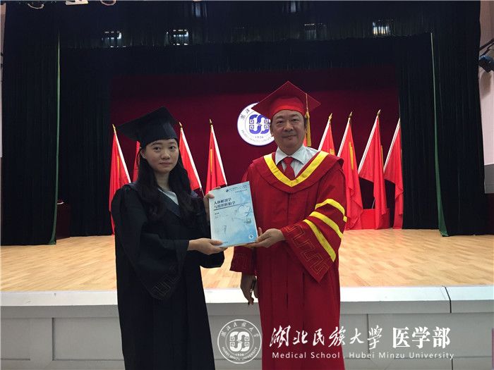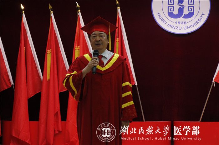 典礼在庄严的国歌声中拉开帷幕。学校副校长、医学部党委书记、主任祝建波致辞并对同学们提出三点嘱托:一是希望同学们以仁爱立德行;二是希望同学们以学习明志向;三是希望同学们以梦想为追求。随后,陈勇宣读《365电子娱乐官方网站医学部2019届优秀毕业生表彰决定》、刘红宣读《 关于拟授予365电子娱乐官方网站2019届医学专业本科毕业生学士学位的决定》,廖云宣读《湖北民族学院科技学院医学系2019届优秀毕业生表彰决定》、《关于拟授予365电子娱乐官方网站科技学院2019届医学专业本科毕业生学士学位的决定》。接着,吴建清等8位导师为每一位身着学士盛装的毕业生援苏正冠、颁授学位证书并合影留念。优秀学生代表张志文发言,他回忆数载大学时光,满怀对母校的感激与自豪之情,也希望毕业生不忘医学初心,勇担医者艰辛,追求卓越创新。教师代表徐俊芳寄语学子:坚守仁心,精进医学,常怀感恩。