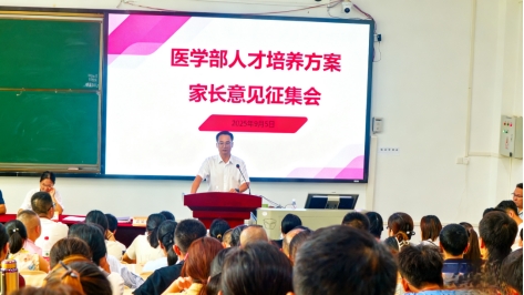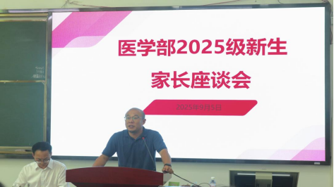 许宗友向家长说明2025级医学部的招生情况及以往同学们上课的学习情况,希望2025级新生将更多时间用在学习上,为将来的医学事业打好坚实基础。