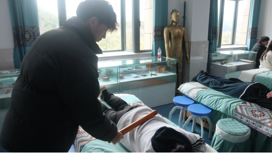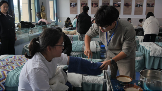 体验中,工作人员会穿插讲解土家医药的趣味渊源:比如三百棒需选秋冬老枝茎,是当地“散寒秘宝”;酒火疗法源自先民“以酒驱寒、以火通阳”的生活智慧。现场师生边体验边交流技法体感、养生技巧,轻缓的操作声与讨论声交织,实验室里暖意融融,既缓解了冬日不适,也让民族医药文化在互动中自然传递。