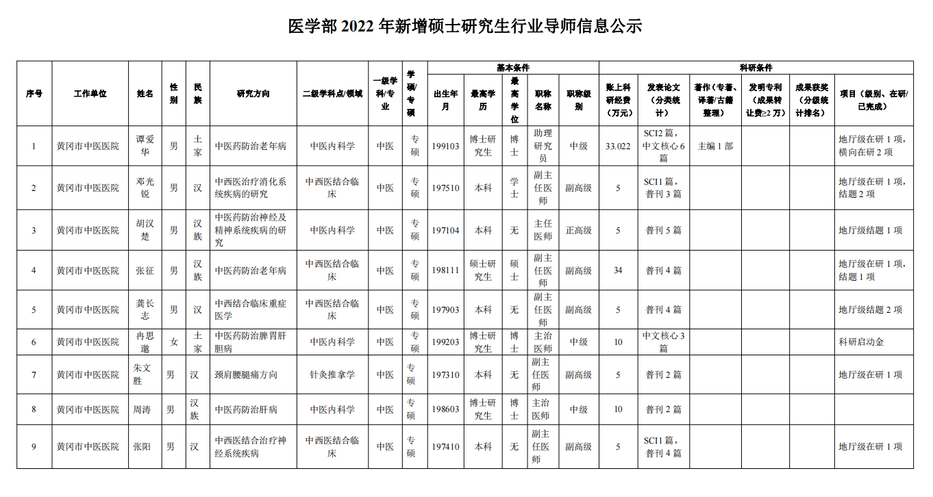 医学部2022年新增硕士研究生行业导师信息公示