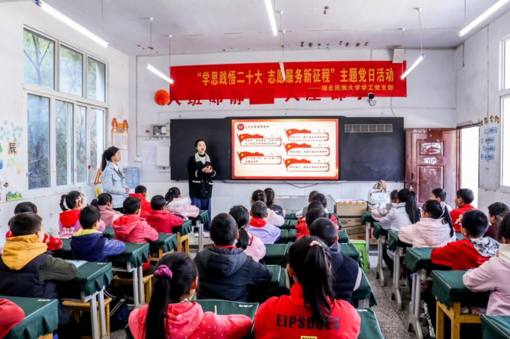 为深入学习宣传贯彻党的二十大精神,进一步弘扬志愿服务精神,3月15日,我校学工党支部赴利川市凉雾乡马前小学开展“学思践悟二十大 志愿服务新征程”特色主题党日活动。学校党委副书记邓磊以普通党员身份出席活动,学工党支部全体党员、学校驻马前村工作人员、校青马班学员代表及马前小学五(1)班36名学生一同参与活动。